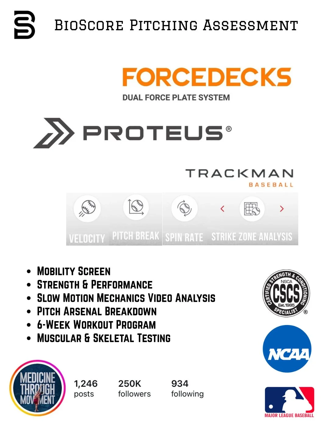 Performance and movement-focused assessment with pitching development expert Bryce McMurray (creator: Medicine Through Movement on Instagram) Here, we will still look at your pitch arsenal and throwing mechanics, but we focus more on identifying movement and mobility concerns and areas that are holding you back. This option provides a deeper technical and in-depth movement screen and muscular analysis and helps identify more specific bodily weaknesses and pinpoints exactly where we are falling short.